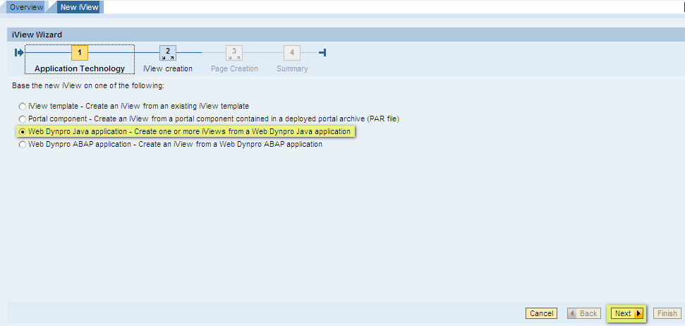 5. In the iView Wizard, select Web Dynpro for JAVA radio button and then press ‘Next’ button.