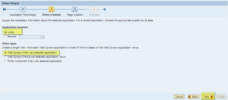6. Select ‘Application Location’ as local and ‘iView type’ as ‘Web Dynpro iView per selected application’ and then press the ‘Next’ button.