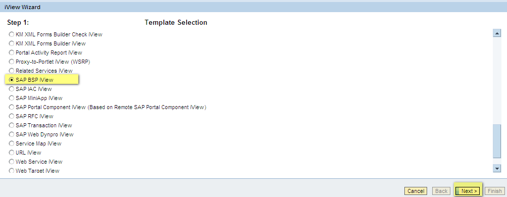 6. Select the SAP BSP iView template and then click on ‘Next’ button.