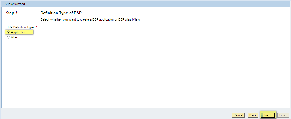 8. Select Application as ‘BSP Definition Type’ and then click on the ‘Next’ button.
