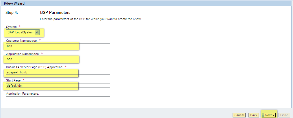 9. Select the System from the drop down list, enter SAP as the customer namespace, SAP as application namespace, BSP application name, start page and application parameters if there are any.