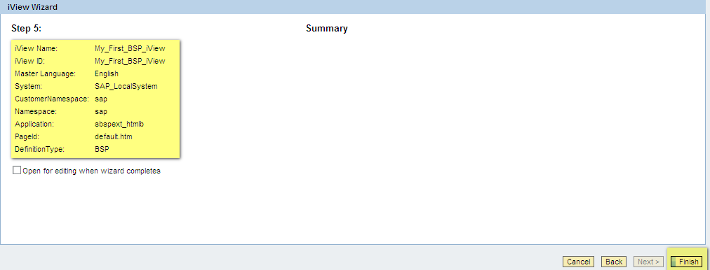10. Click on ‘Finish’ button to complete the process. So, you have successfully created the iView for your BSP application, and now you can assign this Iview to pages, workset, roles and then to the user.