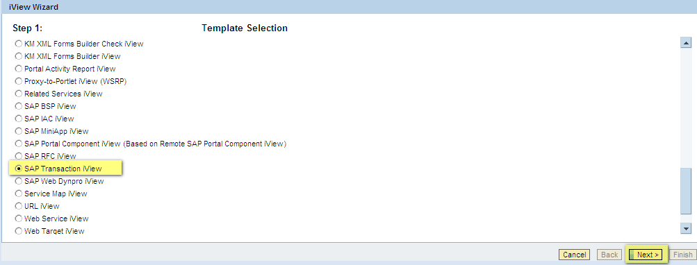 6. Select the SAP Transaction iView template and then click on ‘Next’ button.