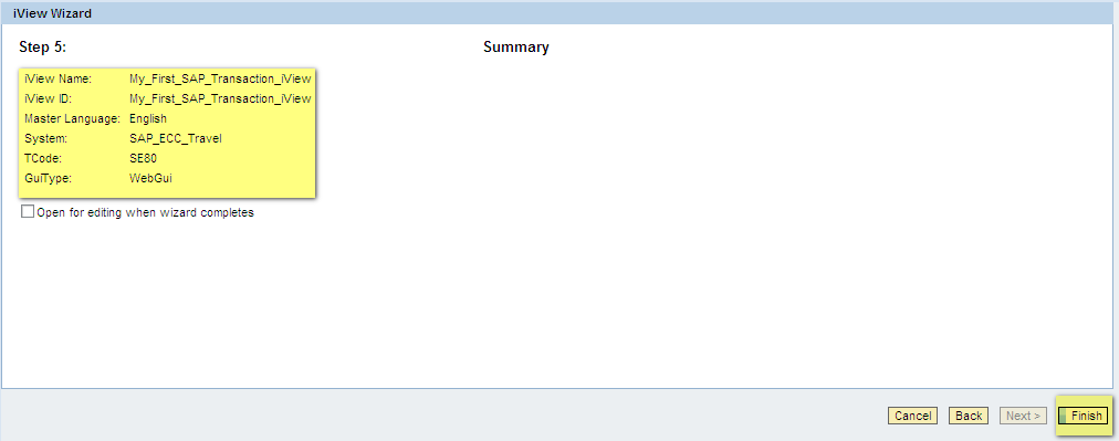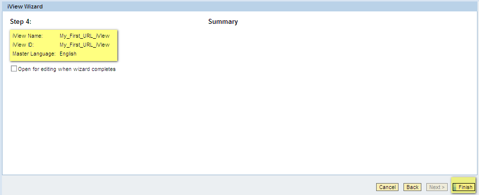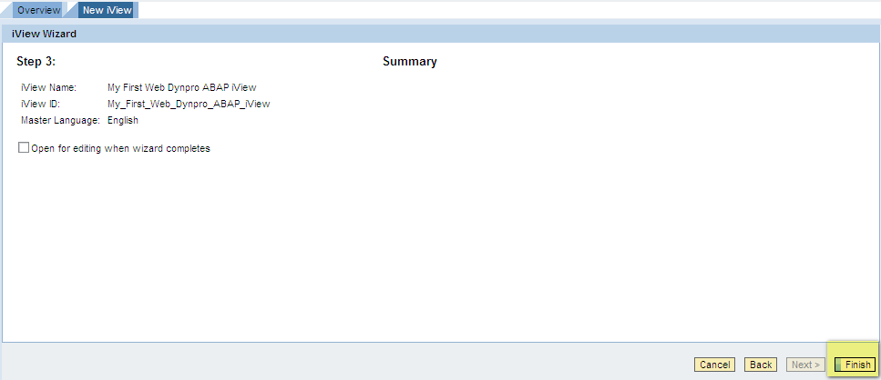Click on ‘Finish’ button to complete the process. Now, you have successfully created the iView for your Web Dynpro ABAP application, and you can assign this iView to pages, workset, roles and then to the user.