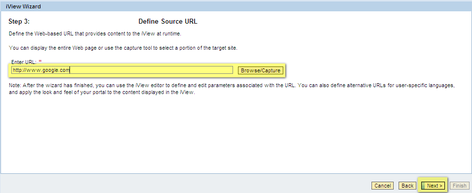8. Give URL that provides content to your iView at runtime, and then press the ‘Next’ button.