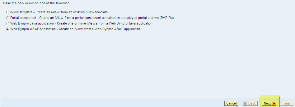 5. This will open the iView wizard, select Web Dynpro ABAP application and then click on the ‘Next’ button.