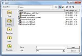 As soon as the dialog opens, it shows a History of some of the reports that I’ve selected previously, as shown in the screenshot above.
