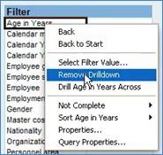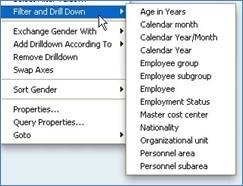 In BW, and SAP in general, there is always more than one way to do things. For instance, right clicking on a field and choosing Drill Down or Drill Across from the context menu does the same as dragging and dropping, and right clicking within the Table’s header row shows options to Exchange and Add Drilldowns According To, which again act in exactly the same way as before.