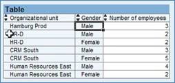 The above example shows the result of dragging a ‘Gender’ field into the ‘Number of Employees’ column, giving a different type of layout to the report: there is now one column for male and another for female, whereas drilling down would have given two rows for each ‘Organisational Unit’.