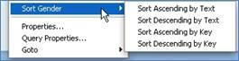 It is also possible to sort from the Properties dialog box. Select whether to sort by Text, Key or Selection, choose the field we want to sort by, and then choose the direction.