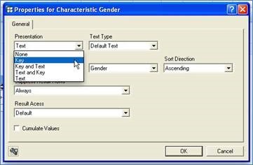 · Presentation sets whether to display the Text, Key or both, as in the Characteristic Properties
