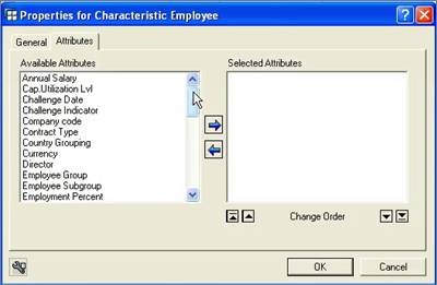 When a characteristic has additional Attributes, an extra tab will appear in the Properties dialog box. Clicking on this tab reveals a list of fields that are associated with the characteristic (‘Employee’ in this example) within the SAP system. Some will match the characteristic fields in the Filter table, some won’t, but either way, every field in the Available Attributes box is there to provide additional information. If a characteristic is available, then always use that instead, as the Queries will be faster and the drilling down functions will be available as well (Attributes do not have this capability, and exist for display purposes only).