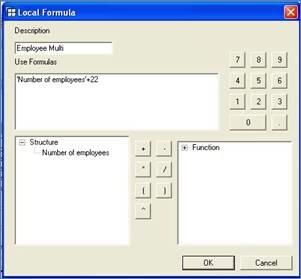 Double clicking on Structure brings up the Local Formula window. This option allows the creation of brand new fields based on Key Figure Fields that already exist in the report. Formulas are created by choosing a Field, and creating a mathematical formula around it. This will create a new field in the Query with the formula applied to each record. There are also some basic mathematical functions (EXP, LOG, NODIM, and SQRT) that can be added into the formula.