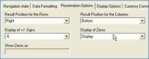 The Presentation Options tab provides options for how the results are formatted, including where the results are positioned, and the amount of zeros to be displayed.
